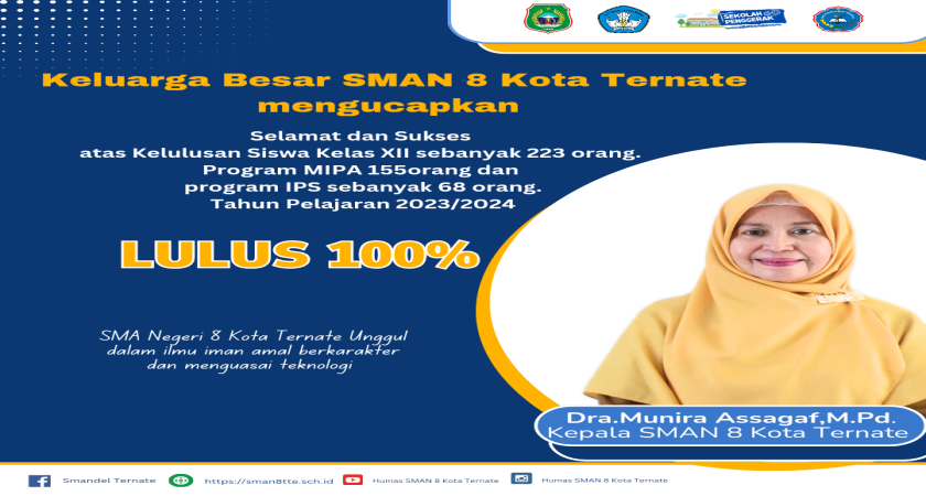 Telah *LULUS* dalam pelaksanaan Ujian Sekolah (US) Tingkat Sekolah Menengah Atas (SMA) Tahun Pelajaran 2023/2024. Demikian, informasi pengumuman resmi kelulusan siswa kelas XII program MIPA dan program IPS SMA Negeri 8 Kota Ternate Provinsi Maluku Utara.