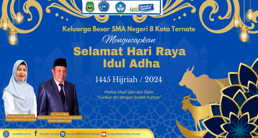 Seluruh Keluarga Besar SMAN 8 Kota Ternate Provinsi Maluku Utara mengucapkan Selamat Hari Raya Idul Adha 1445 Hijriah /2024.